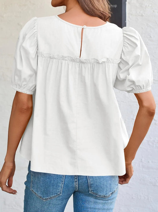 Tiered Round Neck Puff Sleeve Ruched Blouse